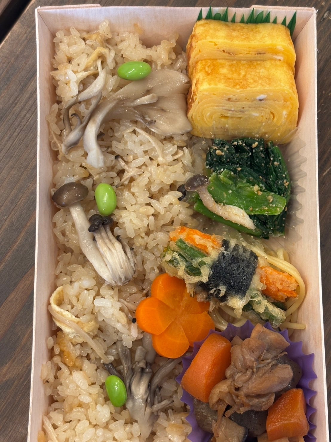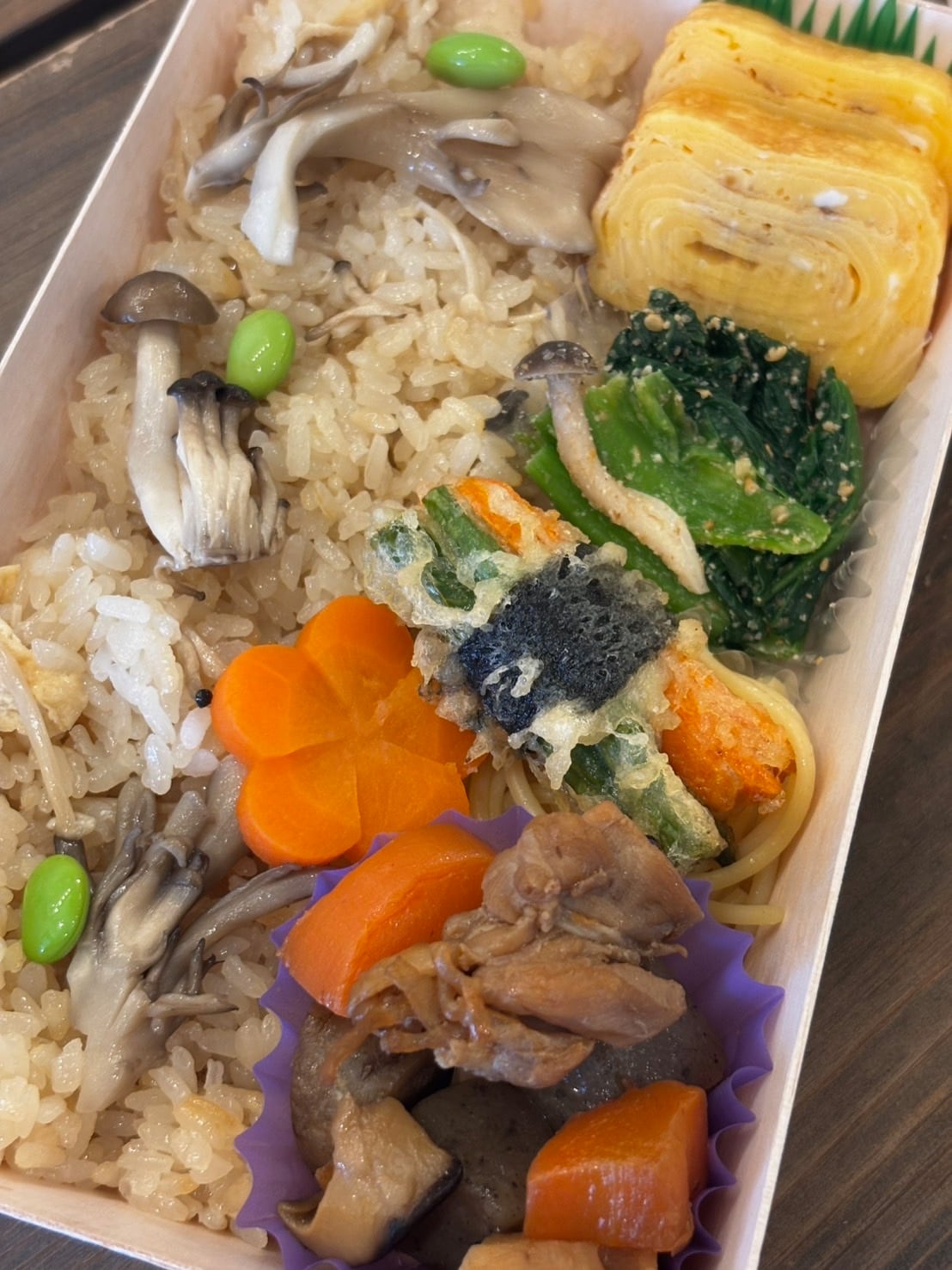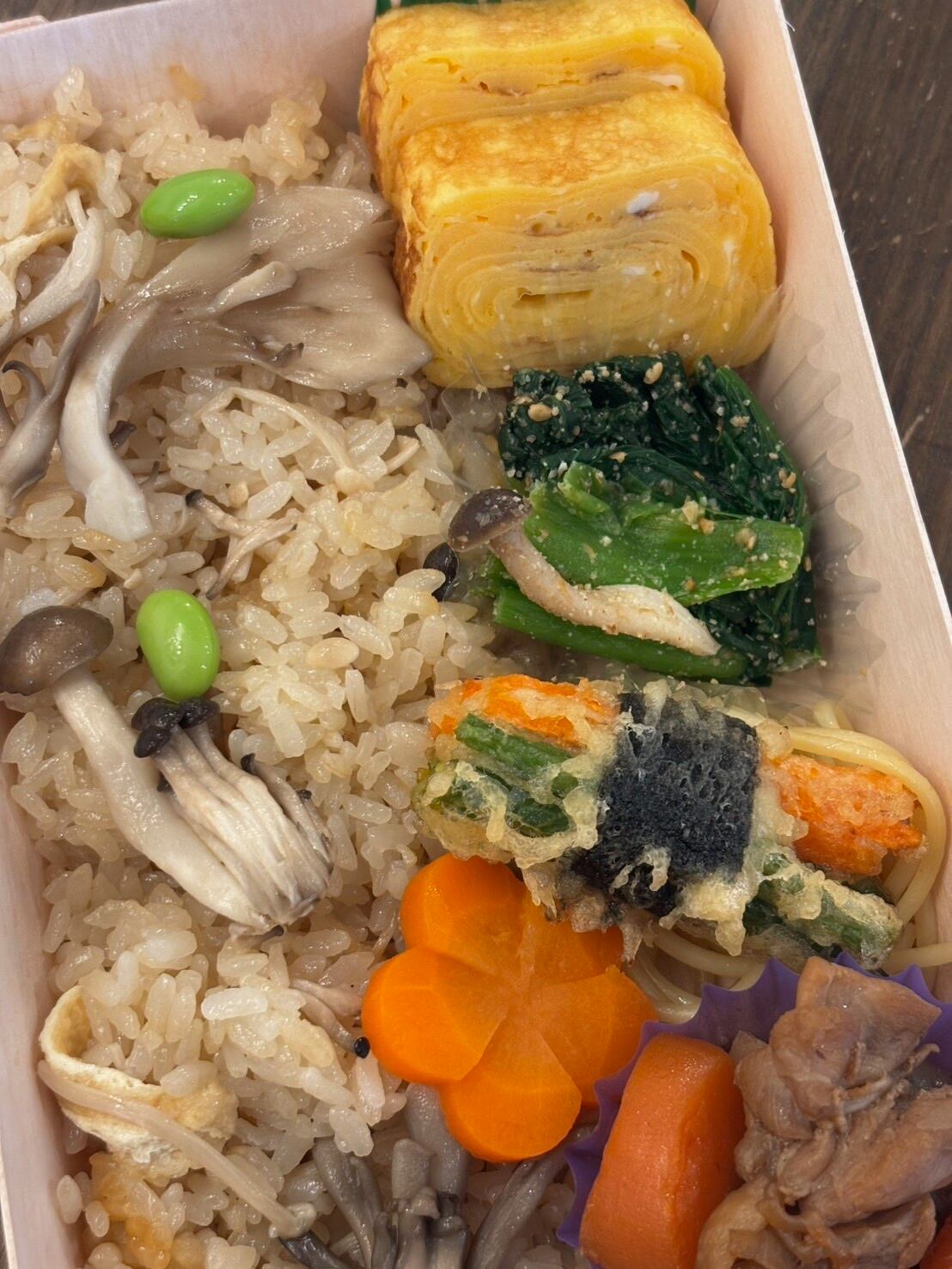 こちらのお弁当は、きのこをふんだんに使った炊き込みご飯と、さまざまなおばんざいを組み合わせた、飽きの来ない美味しさです。きのこの旨味がたっぷり味わえる炊き込みご飯は、口の中で広がる優しい風味が特徴。おばんざいは、ヘルシーで栄養満点な副菜が揃い、心地よい満足感を与えてくれます。